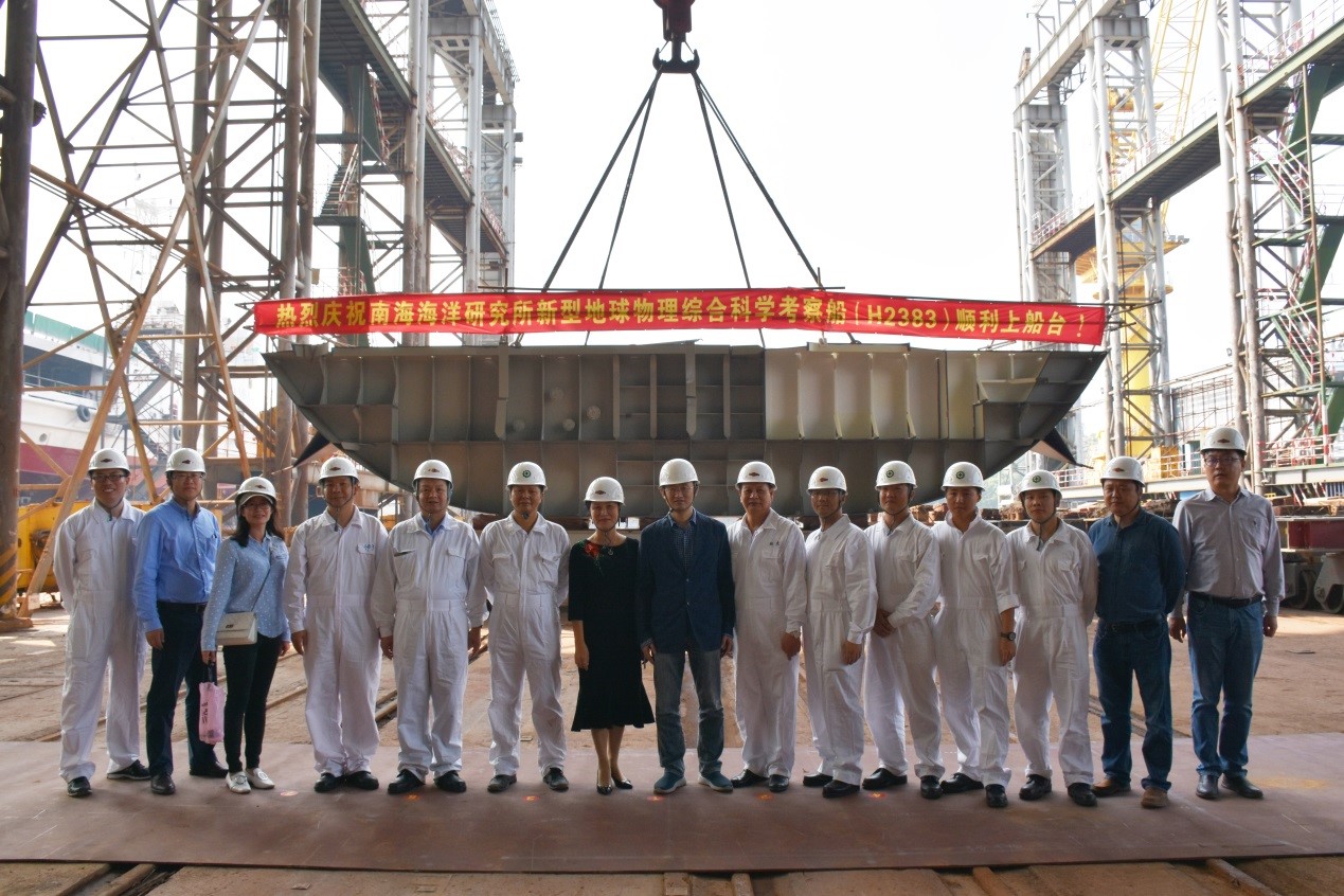 11月18日,新型地球物理綜合科學考察船“實驗6”號上船臺儀式在中船黃埔文沖船舶有限公司隆重舉行。中國科學院南海海洋研究所副所長、工程部經理龍麗娟,副所長杜巖,黨委副書記、紀委書記劉民義,所長助理、工程部副經理孫龍濤,黃埔文沖船舶有限公司總經理向輝明、紀委書記吳光軍,中國船舶工業集團公司第七〇八研究所經營總監沈偉平、項目經理張燕,中國船級社CCSI監理副總經理王忠等出席。