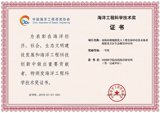 近日,中國(guó)海洋工程咨詢協(xié)會(huì)頒發(fā)了2019年度海洋工程科學(xué)技術(shù)獎(jiǎng)獲獎(jiǎng)項(xiàng)目證書。南海海洋所王友紹研究員團(tuán)隊(duì)項(xiàng)目“紅樹林對(duì)極端環(huán)境響應(yīng)及其分子生態(tài)學(xué)適應(yīng)機(jī)”和喻子牛研究員團(tuán)隊(duì)項(xiàng)目“南海硨磲規(guī)?;斯し庇椭信嗉夹g(shù)體系構(gòu)建及其在生態(tài)修復(fù)中應(yīng)用”兩項(xiàng)成果均榮獲2019年度海洋工程科學(xué)技術(shù)獎(jiǎng)基礎(chǔ)研究類、社會(huì)公益類一等獎(jiǎng)。