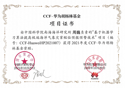 近日,由中國科學院南海海洋研究所高級工程師周巍主持申報的CCF-華為高性能計算優秀青年創新項目“基于機器學習算法提高極端海洋氣象災害短臨預報預警技術”獲2021年度中國計算機學會(CCF)-華為胡楊林基金資助。