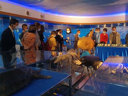 隨后,學員們來到南海海洋生物標本館,在標本館工作人員陪同下聽取了該館的主要職能和社會責任。參觀了標本館的各種海洋生物標本,如大型的剝制標本、浸制標本和海洋貝類標本等,并參觀了海草生態科普展廳,了解了館內曾母暗沙模型的由來。