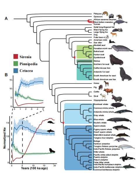 (A)35種海洋哺乳動物和16種陸生哺乳動物的系統發生樹 (B)不同類別海洋哺乳動物譜系的種群歷史動態
