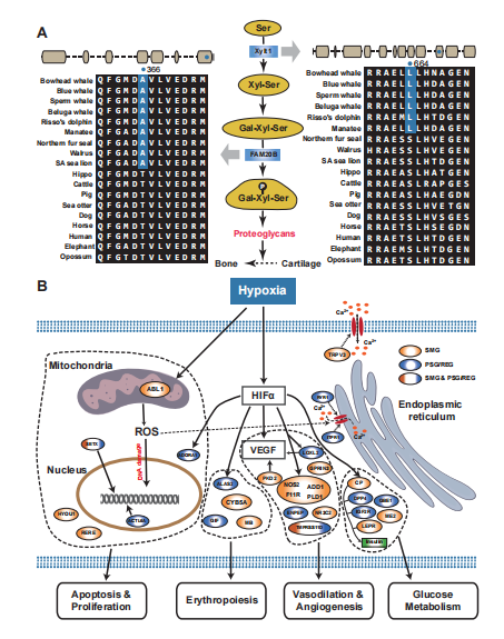 海洋哺乳動物為了適應水生環境,其骨骼形態也發生了不同程度的改變:前肢變成鰭狀肢,身體呈流線型或者紡錘形。該研究發現與骨骼發育密切相關的蛋白聚糖的生物合成途徑中,XYLT1和FMA20B兩個關鍵基因在海洋哺乳動物中發生了特異性改變(圖3),這極有可能會影響到海洋哺乳動物骨骼形態的變化。