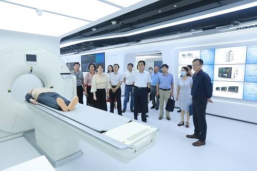 隨后謝廣祥等前往國家高性能醫療器械創新中心展廳參觀,聽取預防、診斷、治療、康復領域的高端醫療設備的介紹,并重點了解了創新中心成員單位支持抗擊新冠肺炎疫情的醫療設備研發情況。